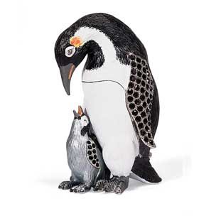 Mother and Baby Penguin Jeweled Trinket Box: penguin mother and child jeweled gift box, 2 x 1.75 x 3 inch. Our colorful hand-painted jeweled collectibles make wonderful gifts or treasured keepsakes. These charming jeweled boxes feature a swirl-design enameled interior, sparkling crystals and magnetic closures for a more secure fit. Each jeweled collectible is packaged in a beautiful tufted satin-lined presentation box perfect for wrapping.