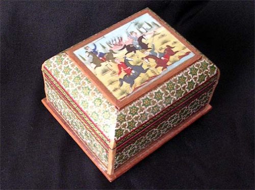 khatam karee means "hand-inlaid." To inlay is to apply wood, metal fragments and other materials in geometric shapes to decorate the surface of various objects. The average is 250 pieces for every cubic centimeter of inlaid work.The box features khatam inlay on the top and sides as well as on the bottom. The interior is also fully inlaid, as shown in the pictures.The hand-painted lid features Mongol tribesmen engaged in a game of polo. Led by the legendary Genghis Khan, the Mongols invaded Persia in the early 13th century and brought a lasting influence on Persian arts and culture.This item would make an excellent gift for anyone who is fond of fine craftsmanship, folk arts, decorators or anyone looking for that extra touch of class for their home.Dimensions: 4.25" L x 5.5" W x 3.75" H (11 cm L x 145 cm W x 9.5 cm H)