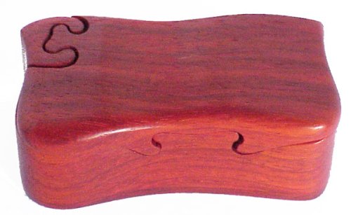 Hand Crafted Jewelry Puzzle Box - Padouk - This is a nice jewelry box, a puzzle box, freehand cut on our bandsaw. The body of the box is made of Padouk, a beautiful cabinet wood from Africa. Padouk is favored by woodworkers for its exotic grain, color and and finishing properties. Our boxes make wonderful treasures and keepsakes as well as making terrific presentation boxes for that special piece of jewelry! Each is signed and dated. The approximate size of this box is 4 x 2 3/4 x 2 inches tall. Each box is lined in a piece of removable brown felt. Each of our boxes is signed and dated. You are purchasing a box which is like the one pictured, but unique. The grain will be slightly different, as each box we make is done by us by hand. All designs are the intellectual property of Phil Baerries, 1972-2007, all rights reserved