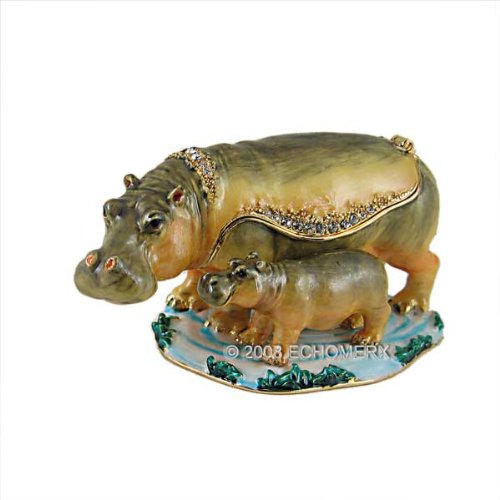'This spectacular trinket box features a mother and baby hippo. Adorned with Swarovski crystals and high polished handpainted enamel. 24k gold plated trim. Generously large inside storage for secret note, jewelry or trinkets. 3-1/4"L x 1-7/8"W x 1-3/4"H. Comes in a satin lined gift box. Jewelry trinket box or keepsake box is the modern day derivative of Limoges Box. Going back to 18th century, when it became noble collectible boxes for royalties, trinket box and jewelry box represented romance, love and style. Today trinket boxes are given as gift in birthdays, weddings, baby shower, celebrating special occasions or collected as unique keepsakes. The body of jewelry trinket box is constructed to endure and secure the safekeeping of one's valuables. Jewelry trinket boxes are still hand-painted and decorated with crystals for glittering sparkles.